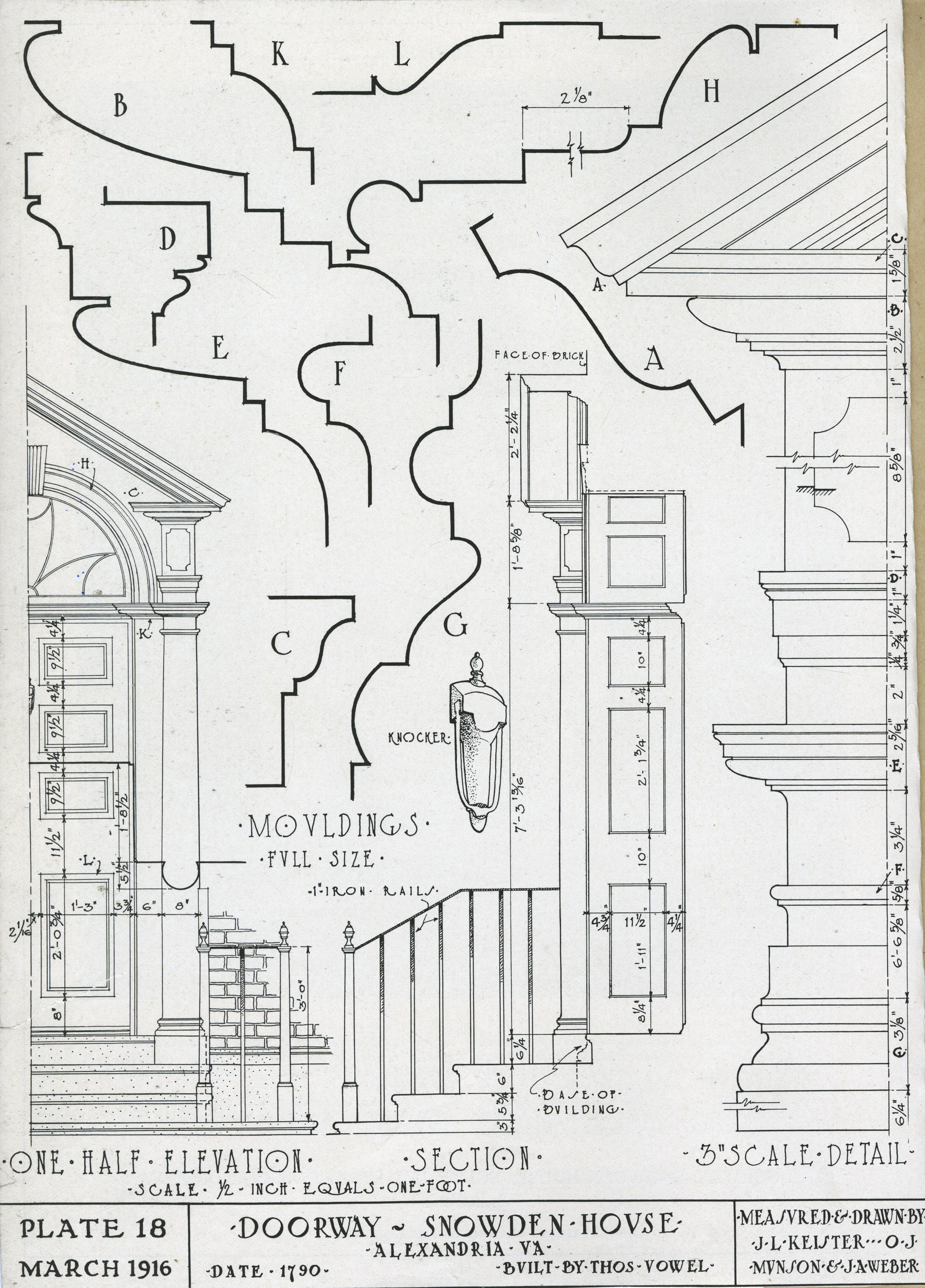 | Description | Location Box 1B Item 34 Back Side Plate Eighteen Doorway, Snowden House, South Lee Street, Alexandria, Virginia 1790 Measured and Drawn by J. L. Keister, O. J. Munson, and J. A Weber |