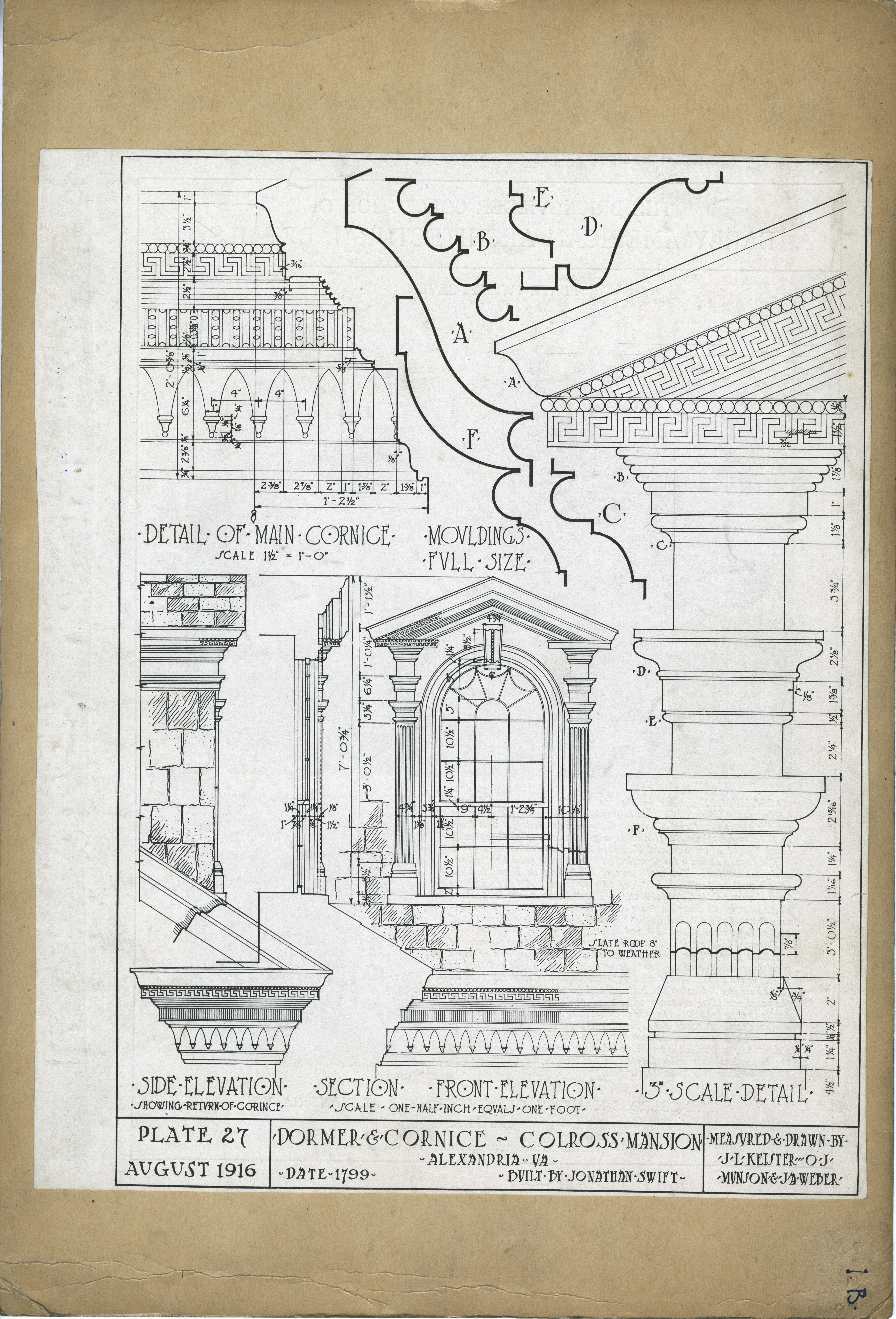 | Description | Location Box 1B Item 41 Plate 27 Dormer and Cornice, Colross Mansion, Alexandria, Virginia 1799 Built by Jonathan Swift Measured and Drawn by J. L. Keister, O. J. Munson, and J. A. Weber |