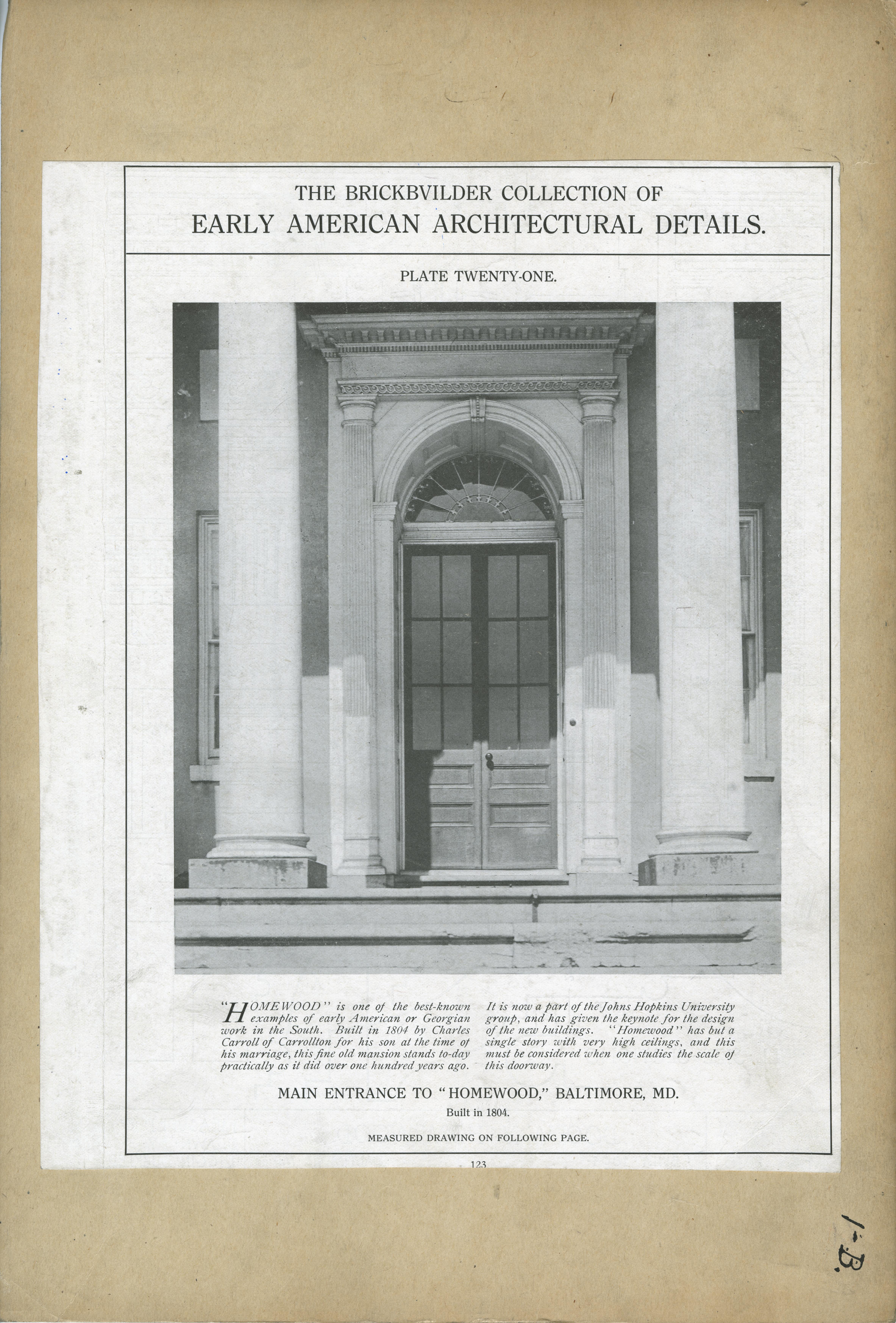 | Description | Location Box 1B Item 51 Front Side Plate 21 Main Entrance to "Homewood" Baltimore, Maryland 1804 Built by Charles Carroll |