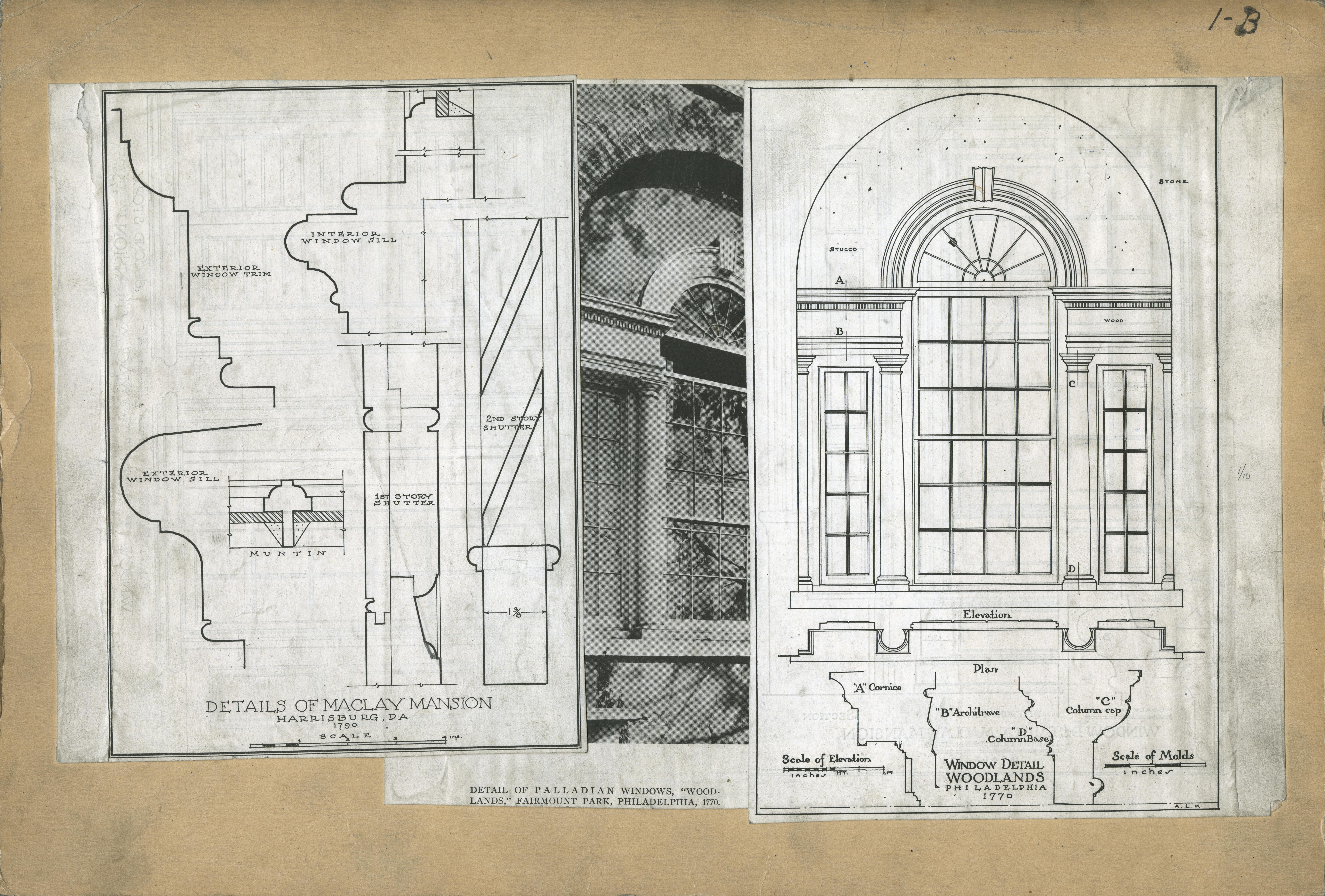 | Description | Location Box 1B Item 74 Front Side Details of Maclay Mansion, Harrisburg, PA Window Detail, Woodlands, Philadelphia 1770 |