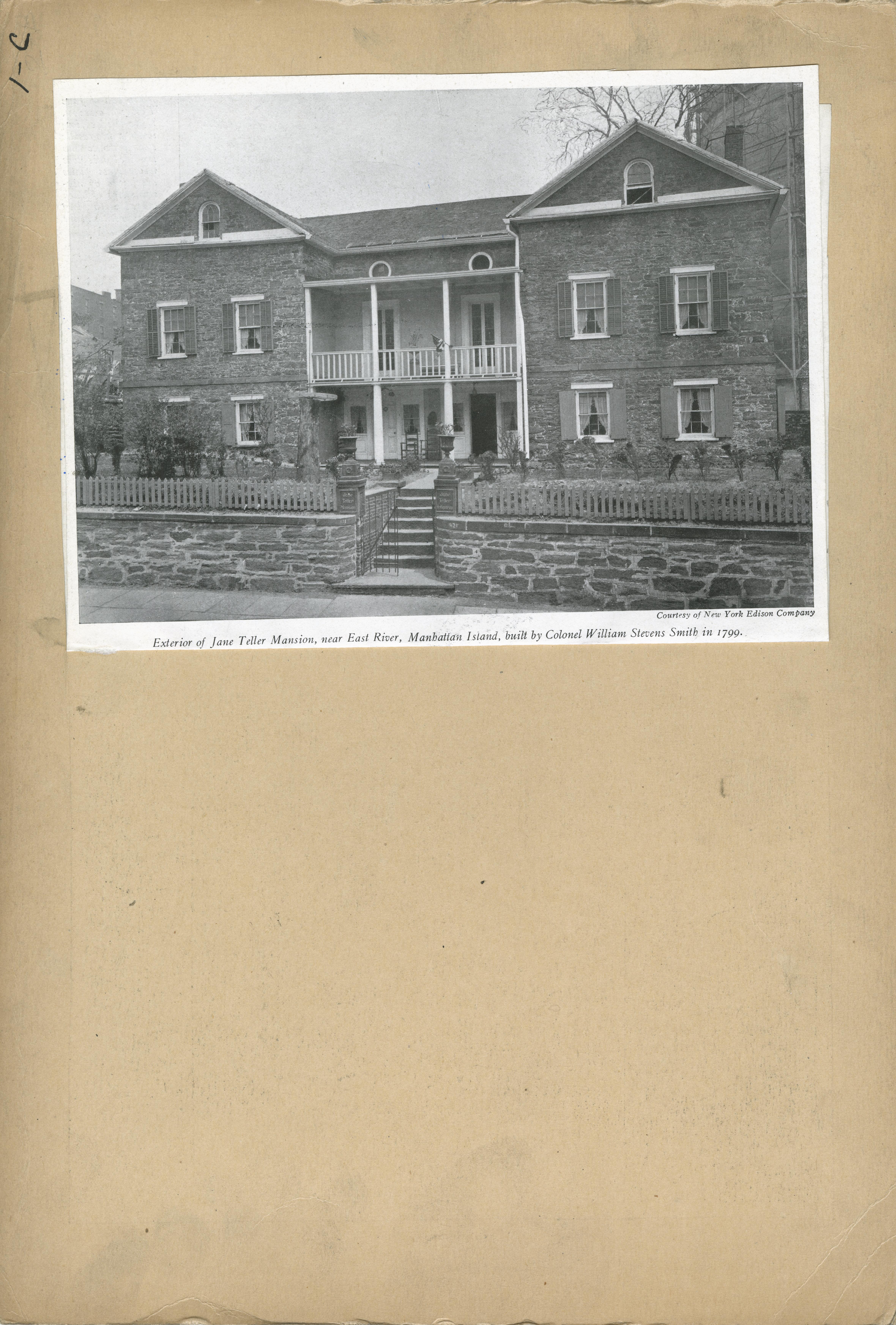 | Description | Location Box 1C Item 37 Back Side Exterior of Jane Teller Mansion, Manhattan Island Built by Colonel William Stevens Smith 1799 |