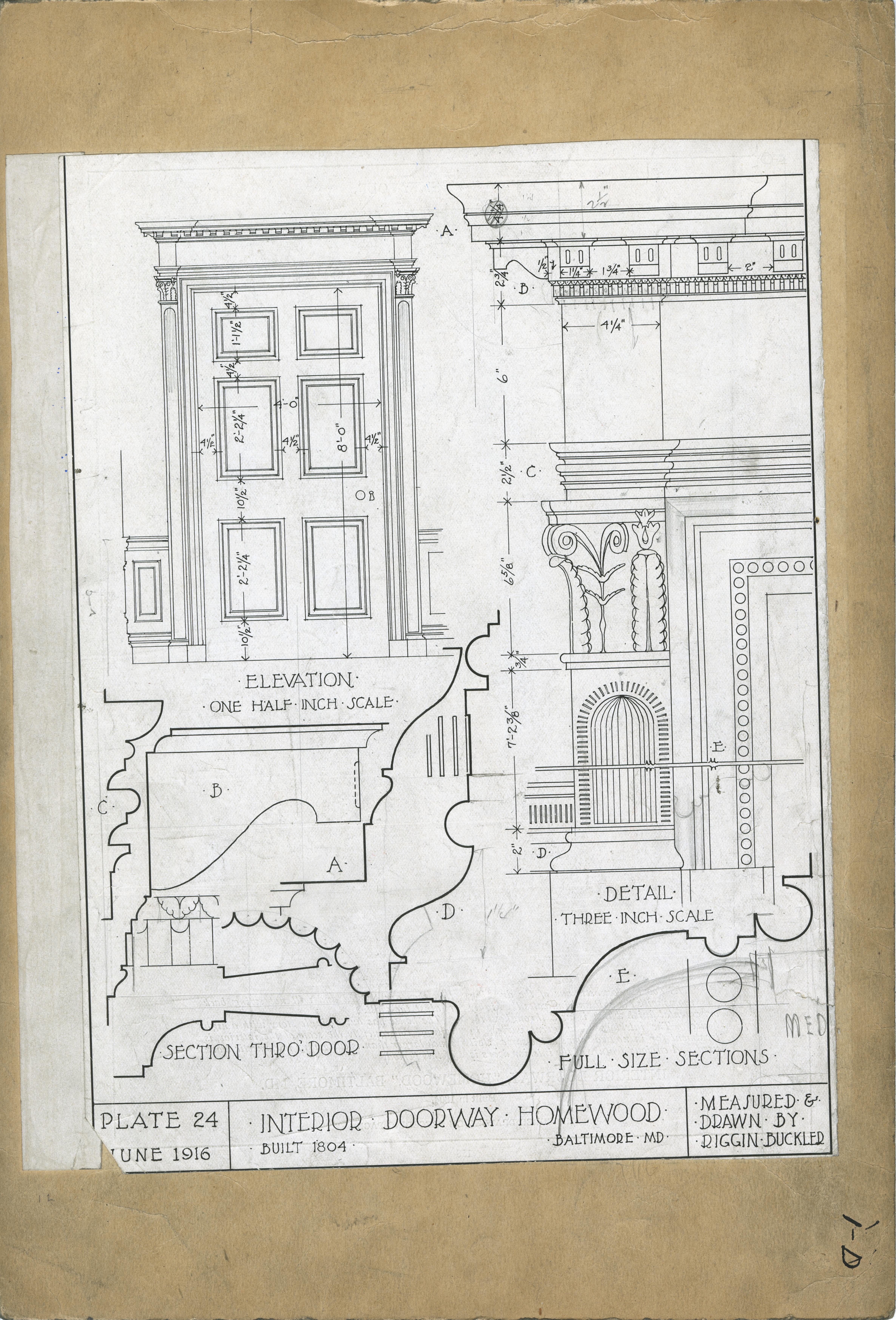 | Description | Location Box 1D Item 9 Back Side Plate 24 Interior Doorway, "Homewood," Baltimore, Maryland 1804 Measured and Drawn by Riggin Buckled |
