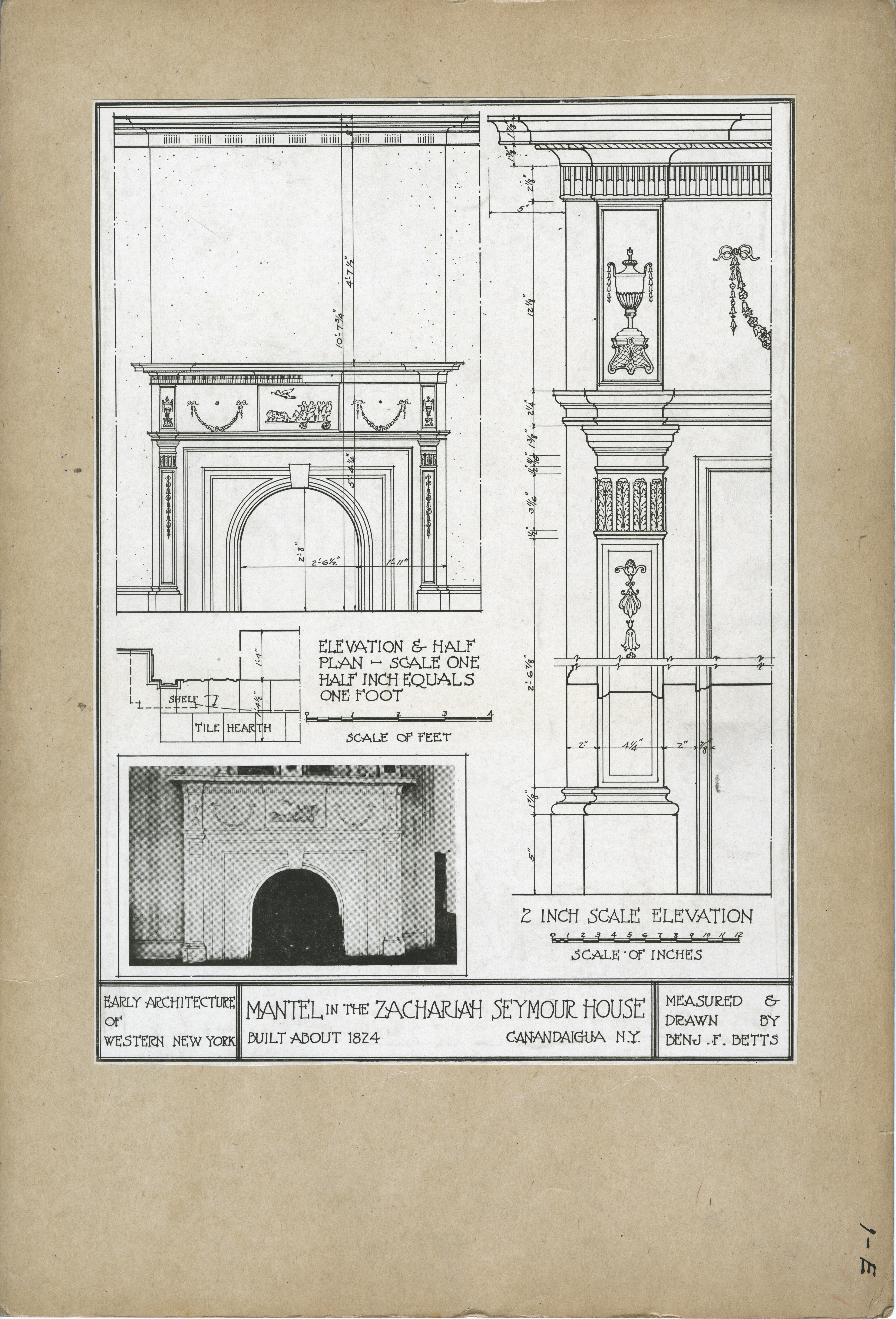 | Description | Location Box 1E Item 25 Mantel in the Zachariah Seymour House, Canandaigua, New York Built around 1824 Measured and Drawn by Benj. F. Betts |