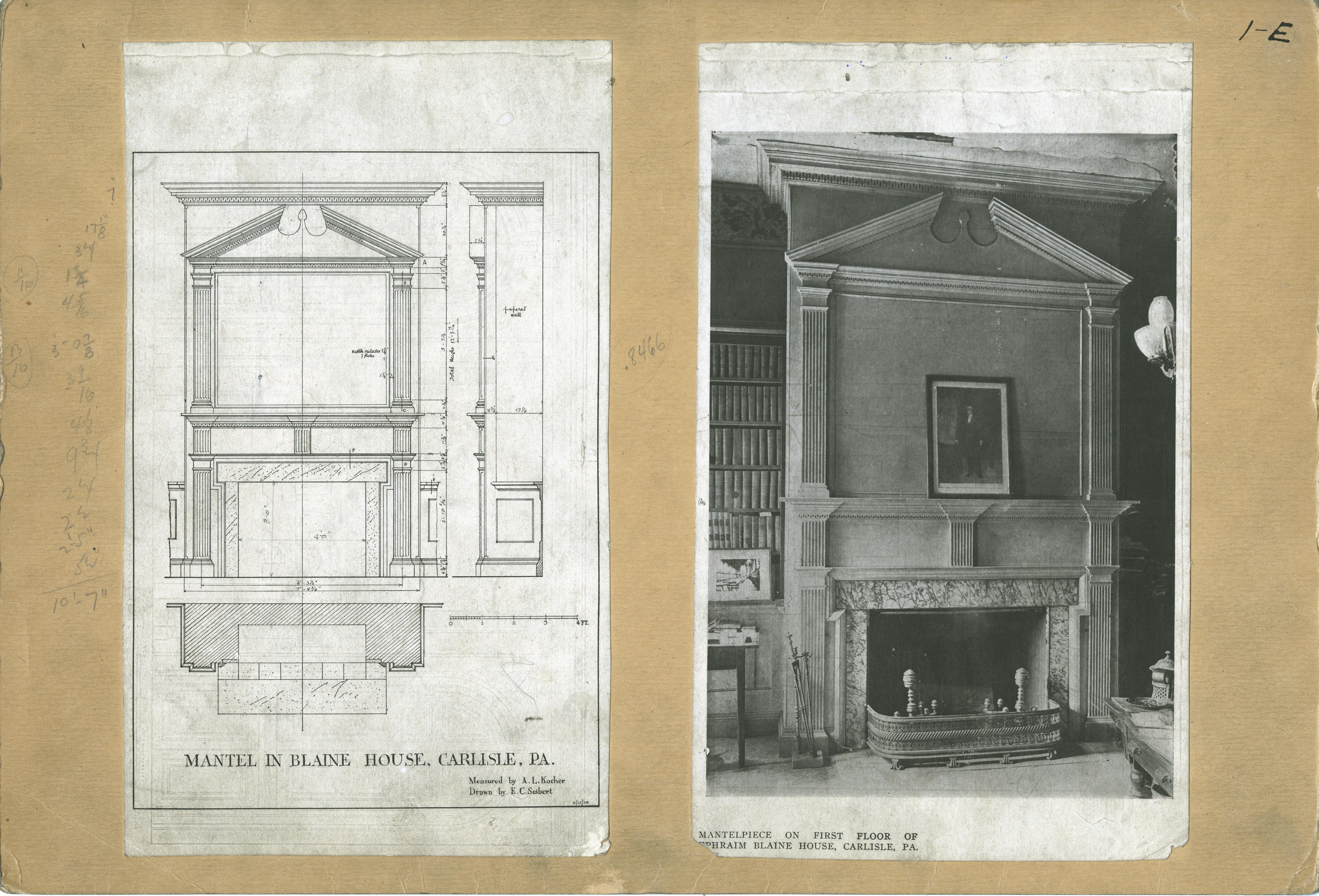 | Description | Location Box 1E Item 36 Mantel in Blaine House, Carlisle, PA Measured by A. L. Kocher, Drawn by E. C. Subert Mantelpiece on first floor of Ephriam Blaine House, Carslile, PA |