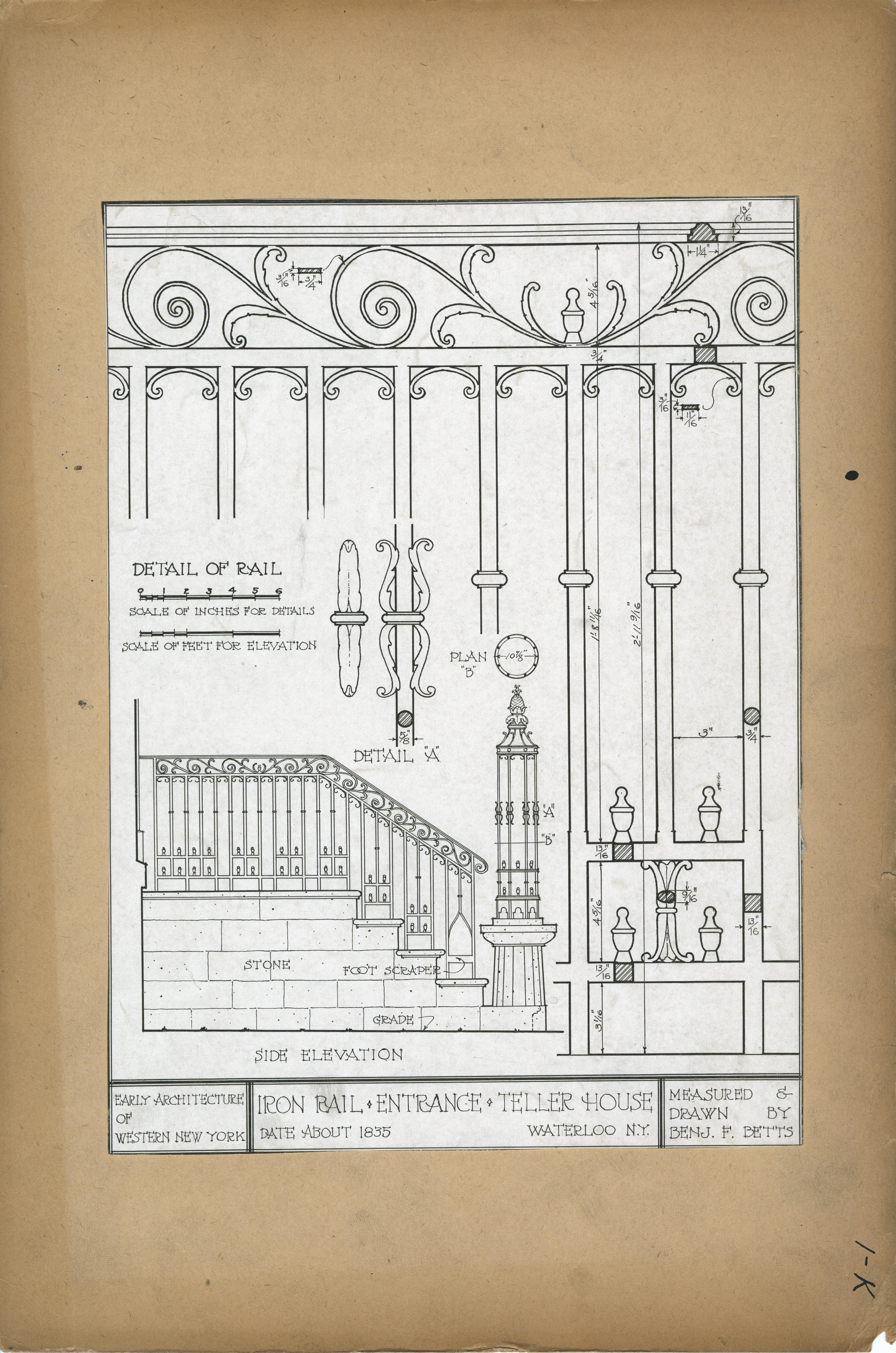 | Description | Location Box 1K Item 9 Iron rail Entrance, Teller House, Waterloo, New York 1835 Measured and Drawn by Benj. F. Betts |