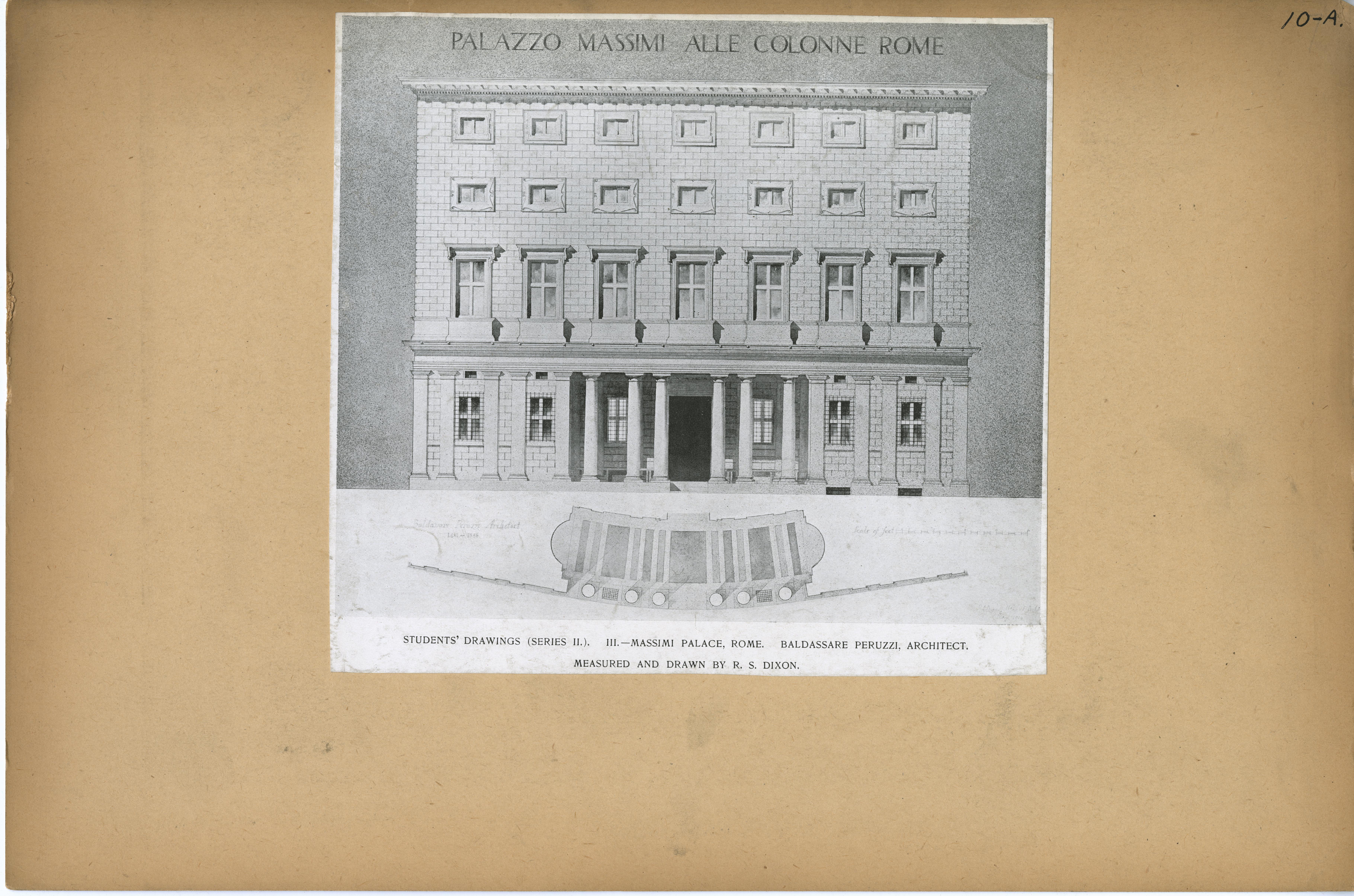 | Description | Location Box 10A Item 57 Students Drawings (Series II.) III.--Massimi Palace, Rome. Baldassare Peruzzi, Architect. Measured and Drawn By R. S. Dixon. |
