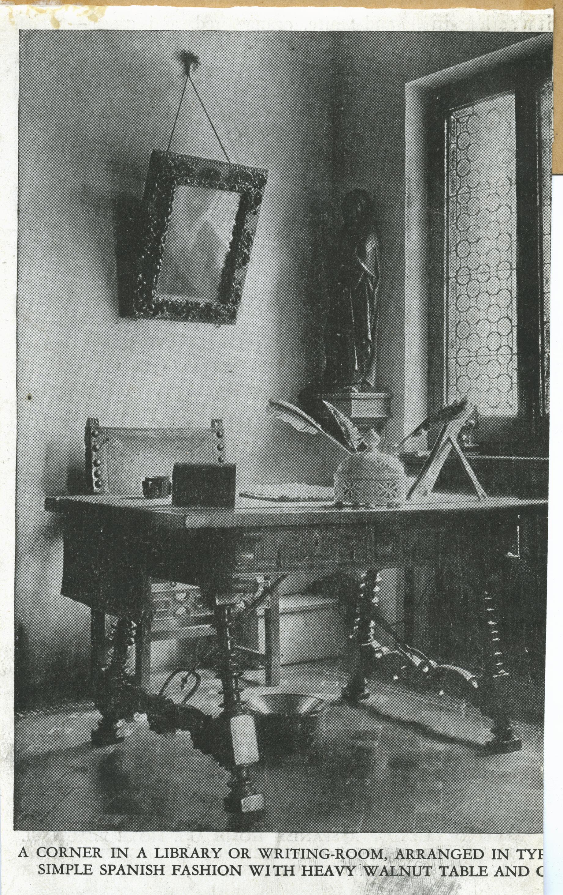 | Description | Location Box 11B File 1 Back Side A Corner in a library or writing room, arranged in typ- simple Spanish fashion with heavy walnut table and- |