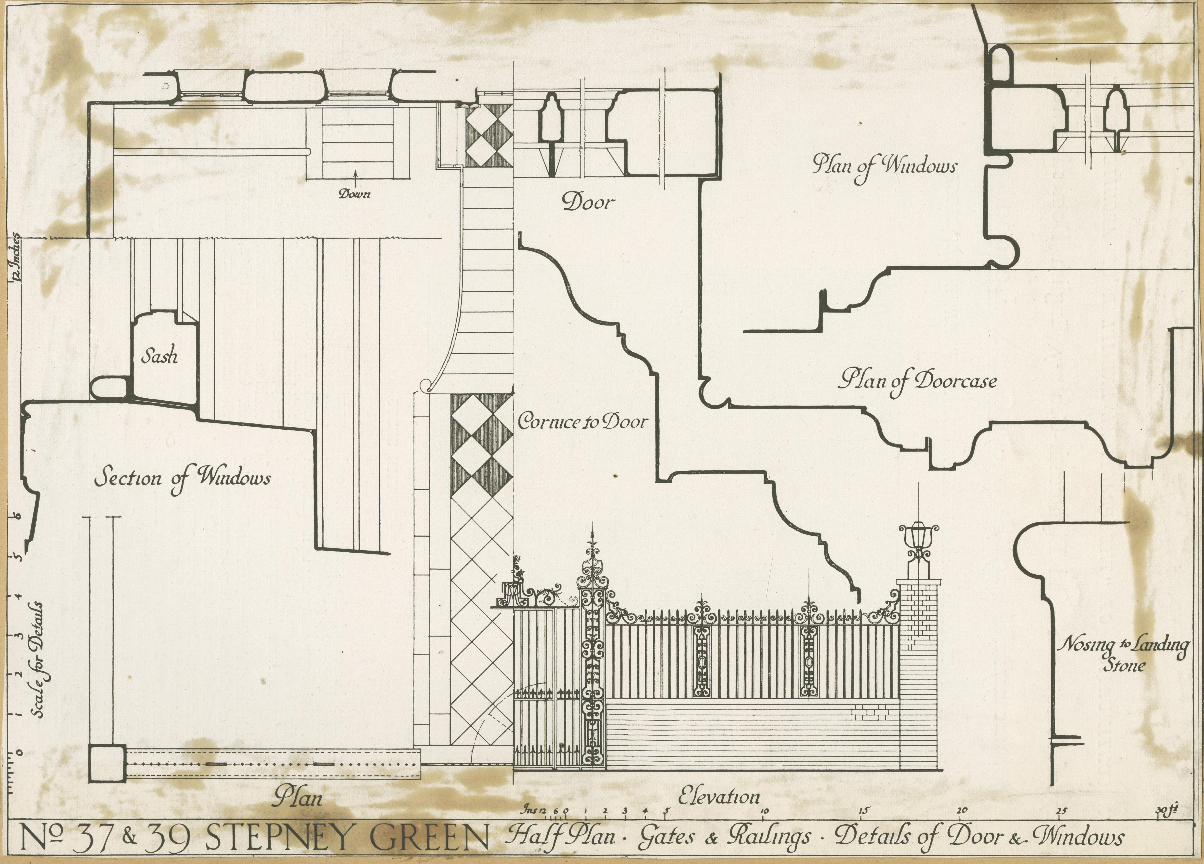 | Description | Location Box 3B Item 5 Page 2 Stepney Green, Half Plan, Gates & Railings, Details of Doors & Windows |