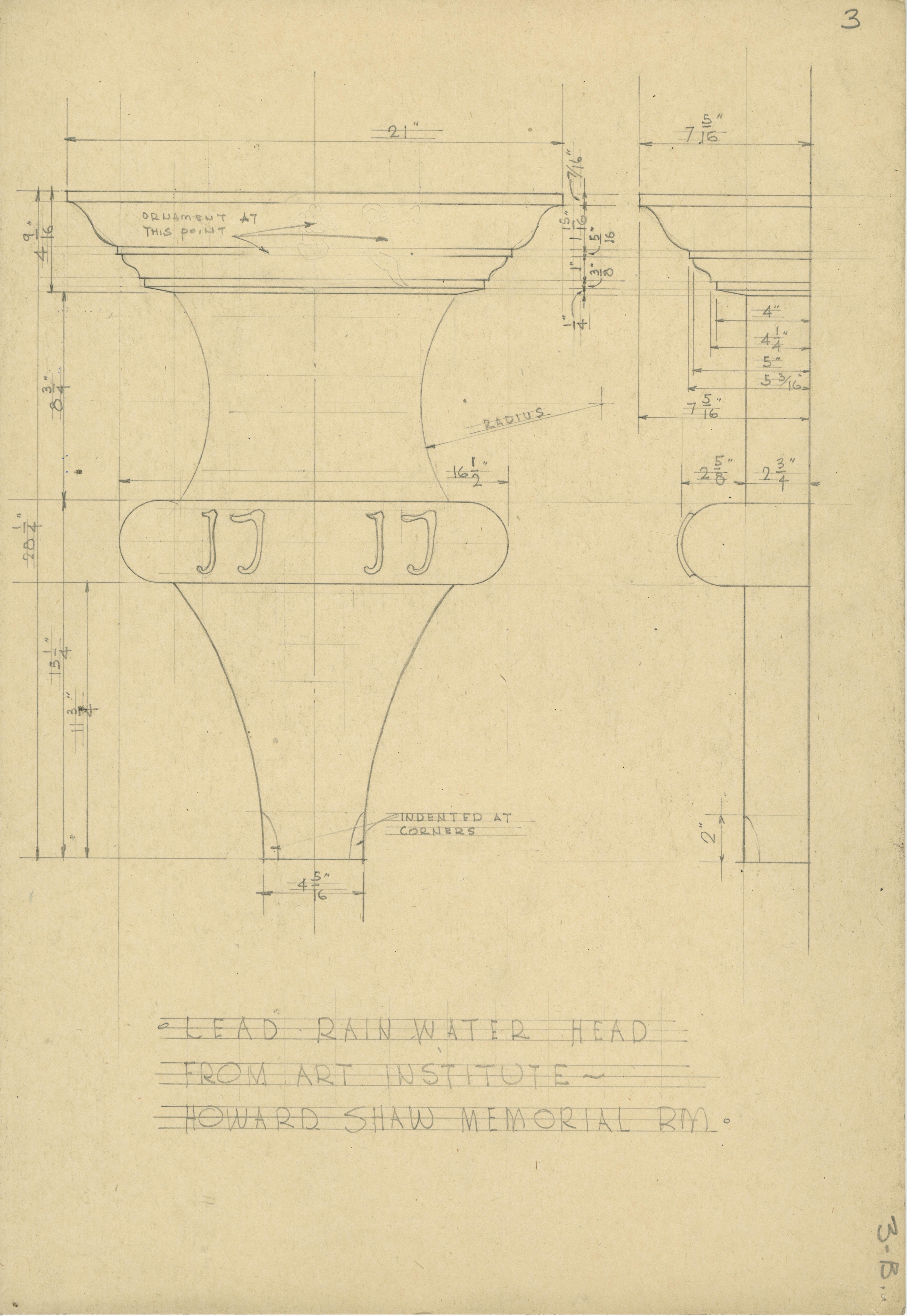 | Description | Location Box 3B Item 7 Lead Rainwater Head from Art Institute Howard Shaw Memorial Room |