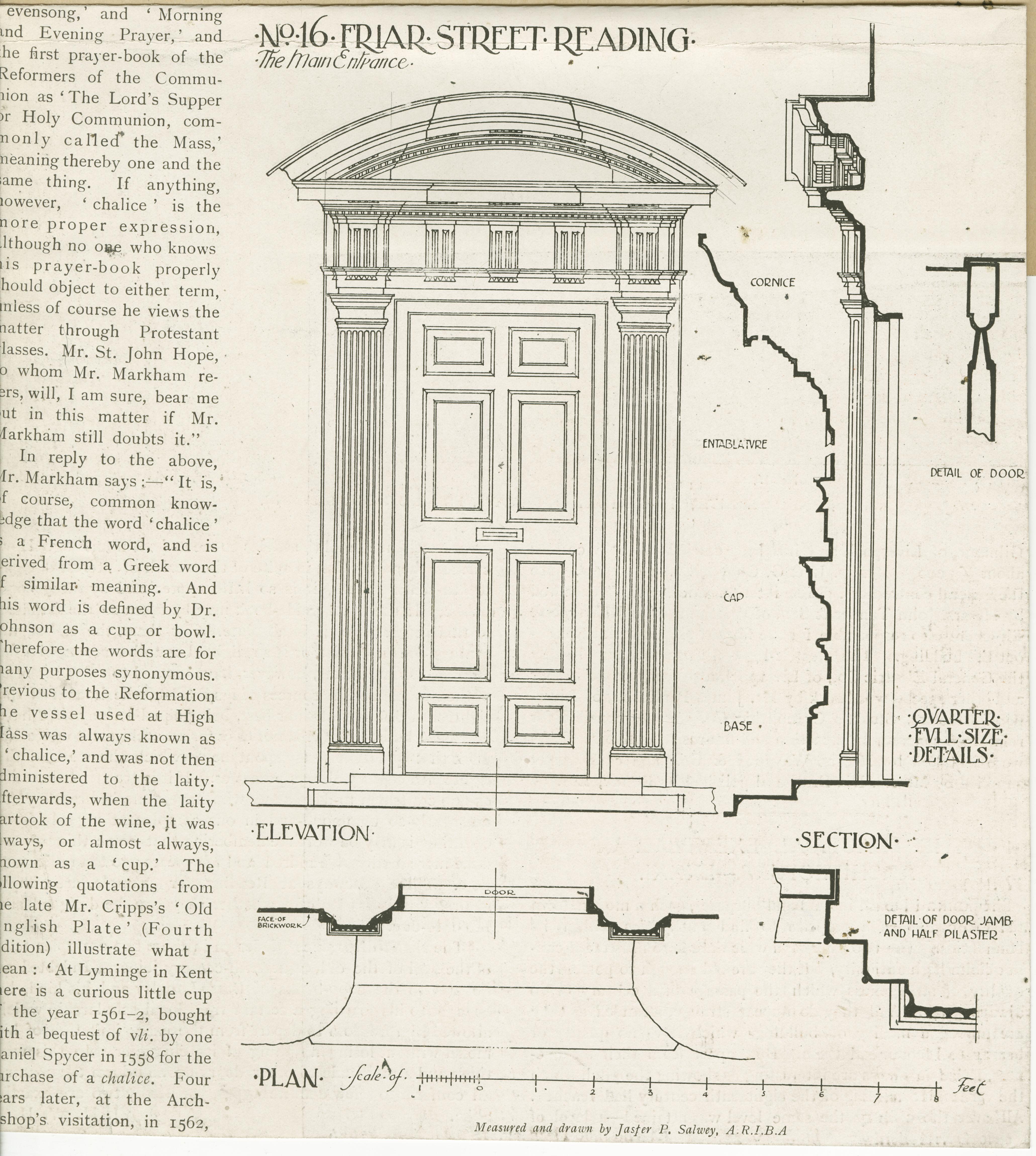 | Description | Location Box 3C Item 15 Page 1 Back Side Eighteenth-Century Doorways, Friar Street, Reading Practical Exemplar of Architecture Article |