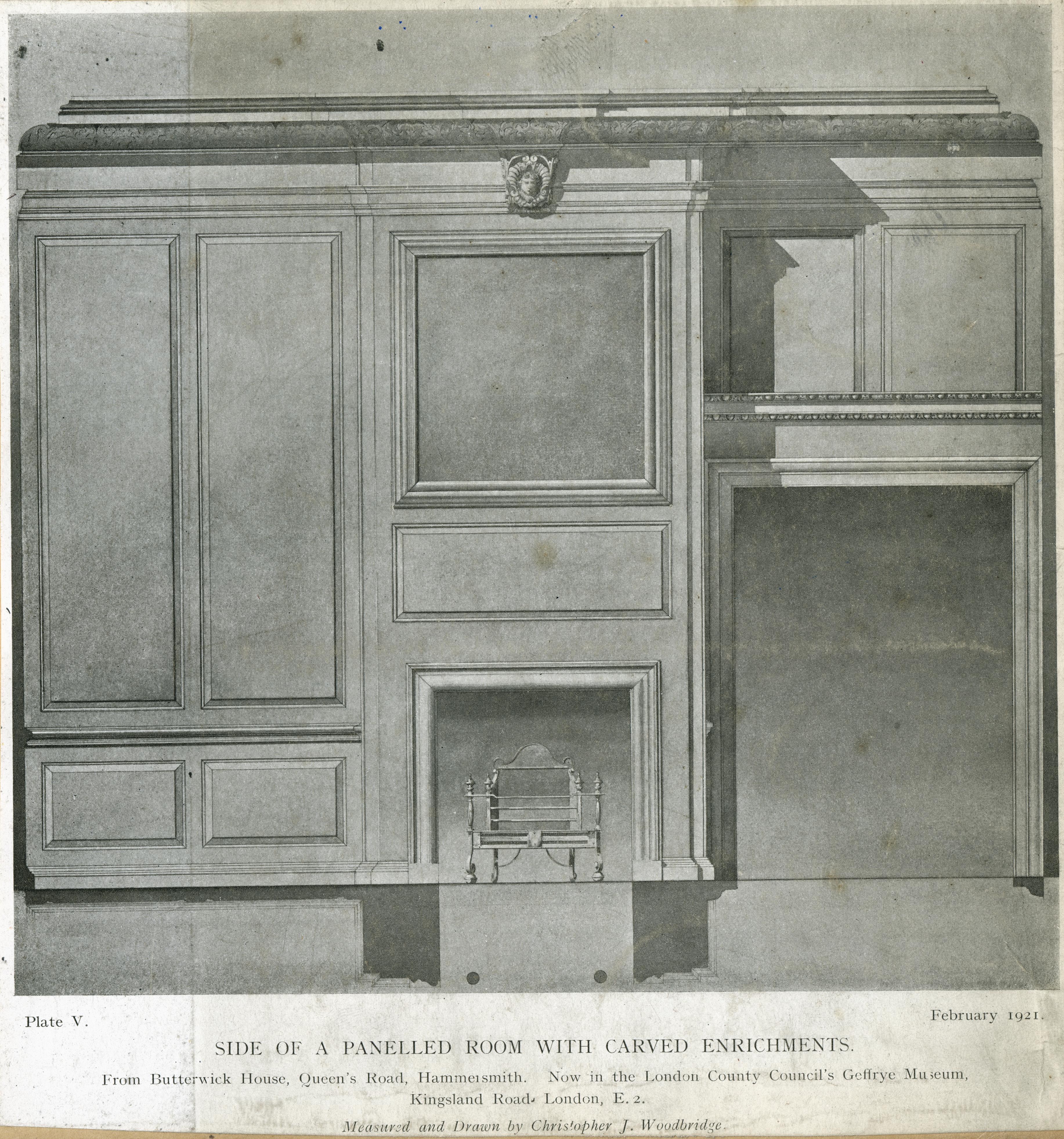 | Description | Location Box 3E Item 17 Second Side Side of a Panelled Room with Carved Enrichments Batterwick House, Queen's Road, Hammersmith Measured and Drawn by Christopher J. Woodbridge |