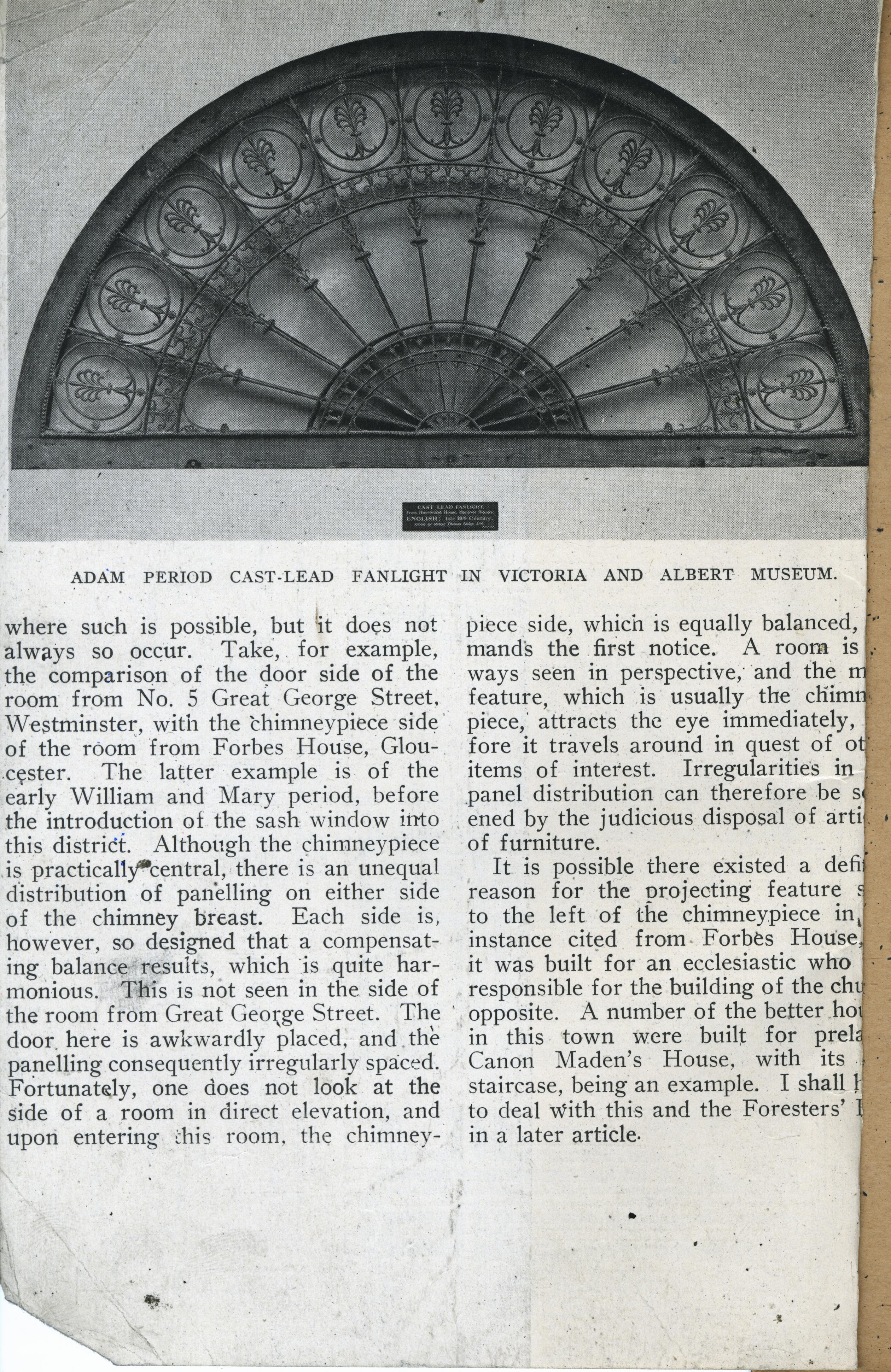 | Description | Location Box 3E Item 69 Page 1 Back Side Adam Period Cast-Lead Fanlight in Victoria and Albert Museum Article |