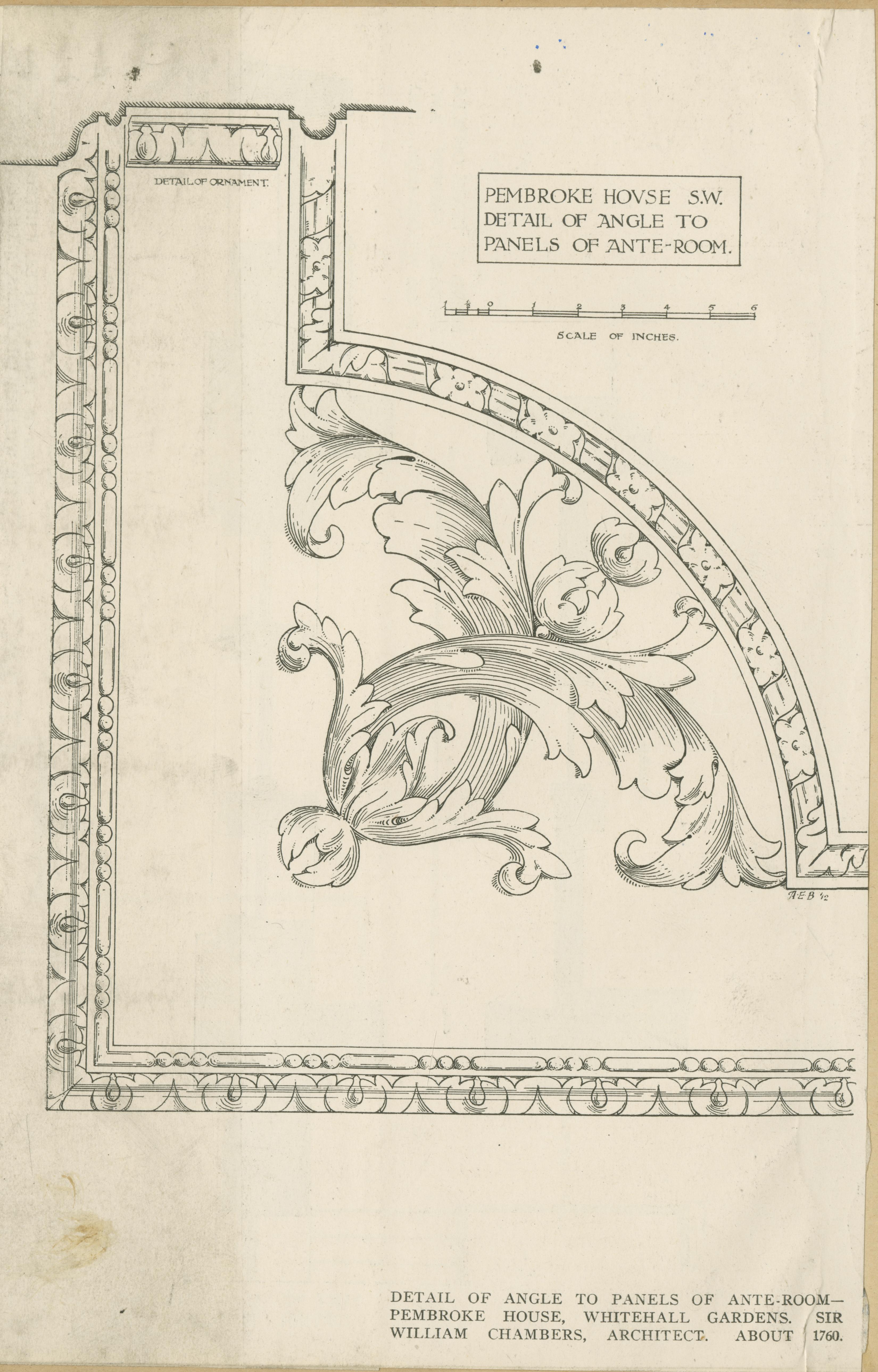 | Description | Location Box 3E Item 78 Page 3 Front Side Detail of Angle to Panels of Ante-Room Pembroke House, Whitehall Gardens 1760 Sir William Chambers, Architect |