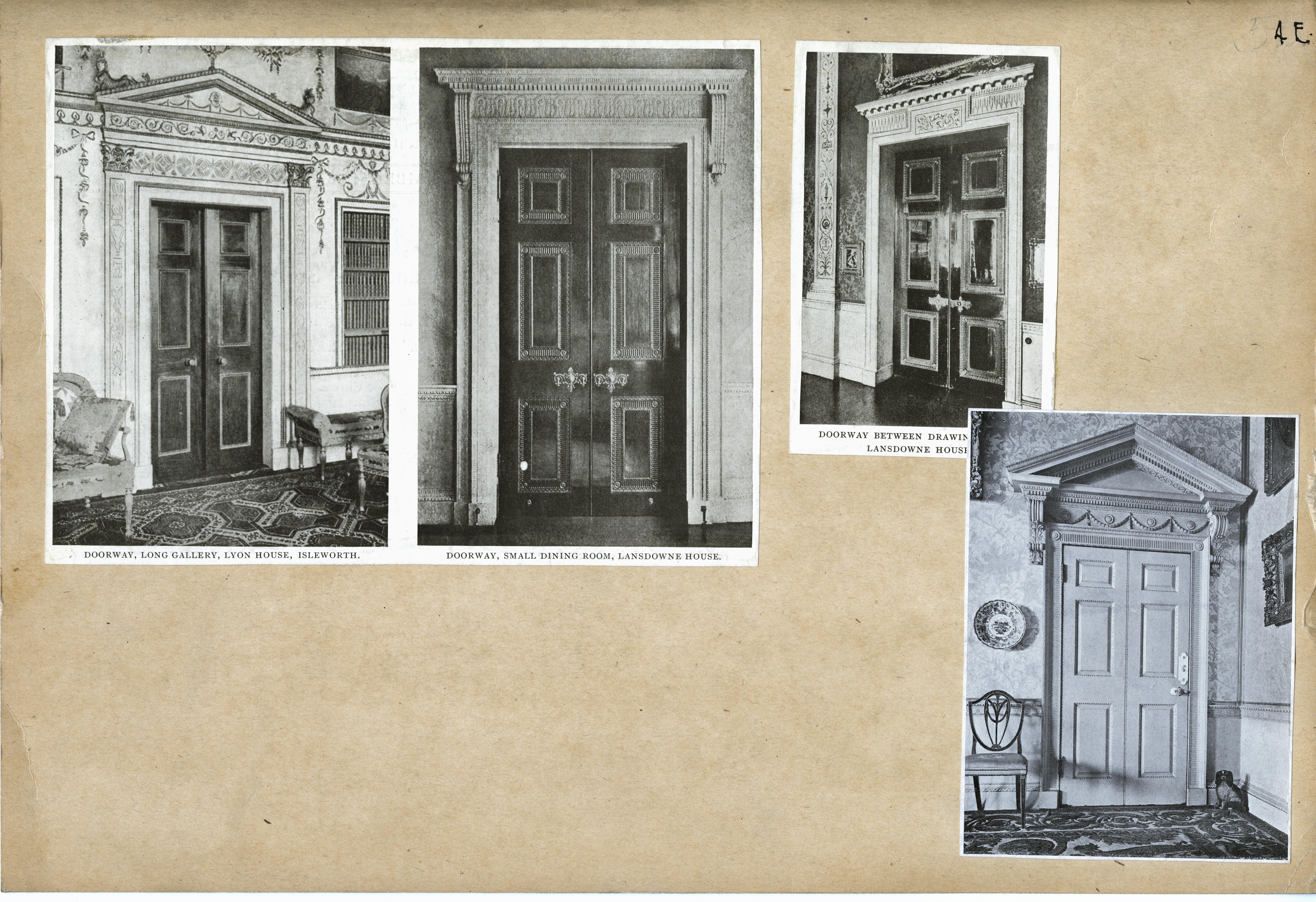 | Description | Location Box 4E Item 9 Doorway, long gallery, Lyon House, Isleworth Doorway, small dining room, Landsdowne House |