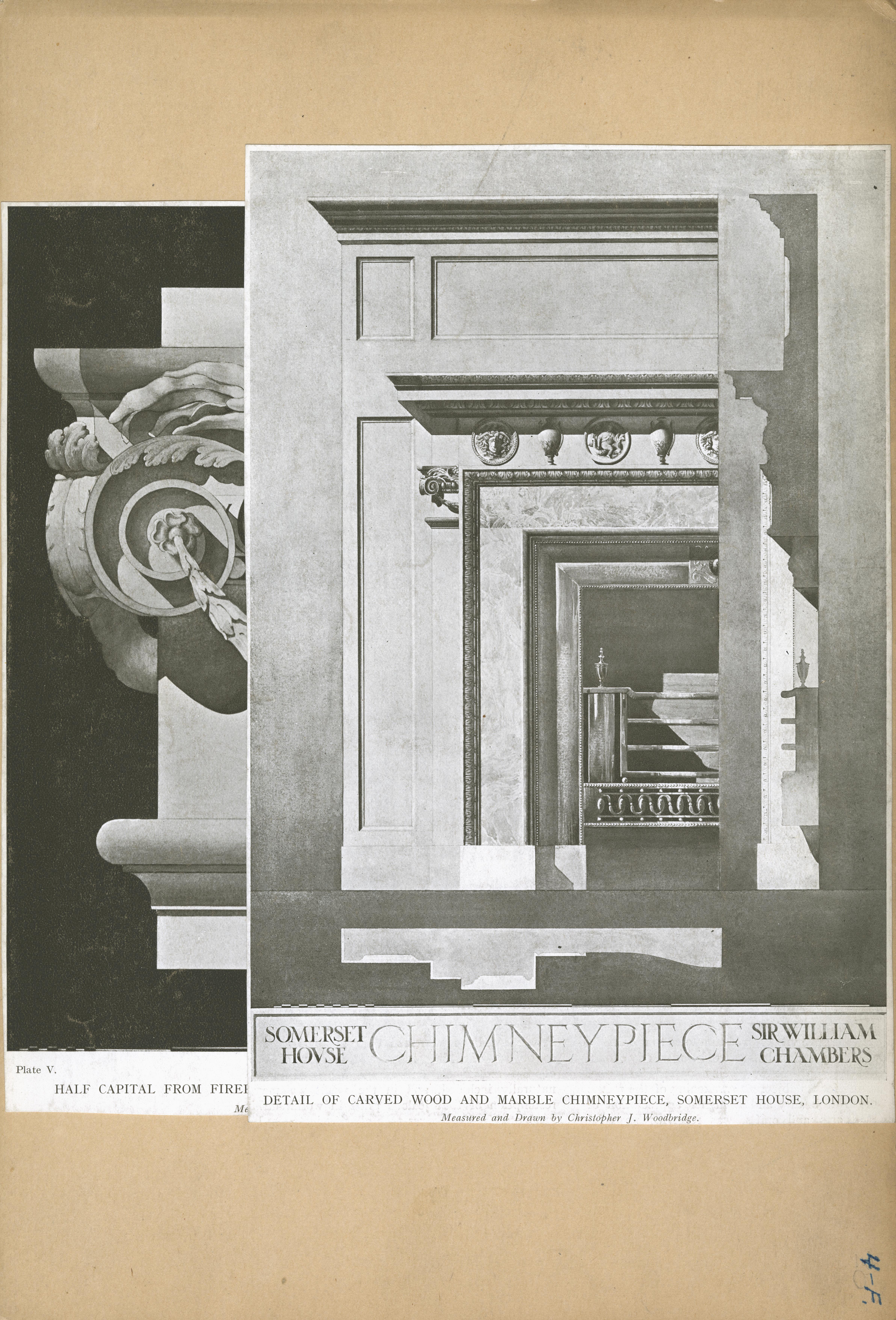 | Description | Location Box 4F Item 16 Page 1/Front side Detail of carved wood and marble chimneypiece, Somerset House, London |