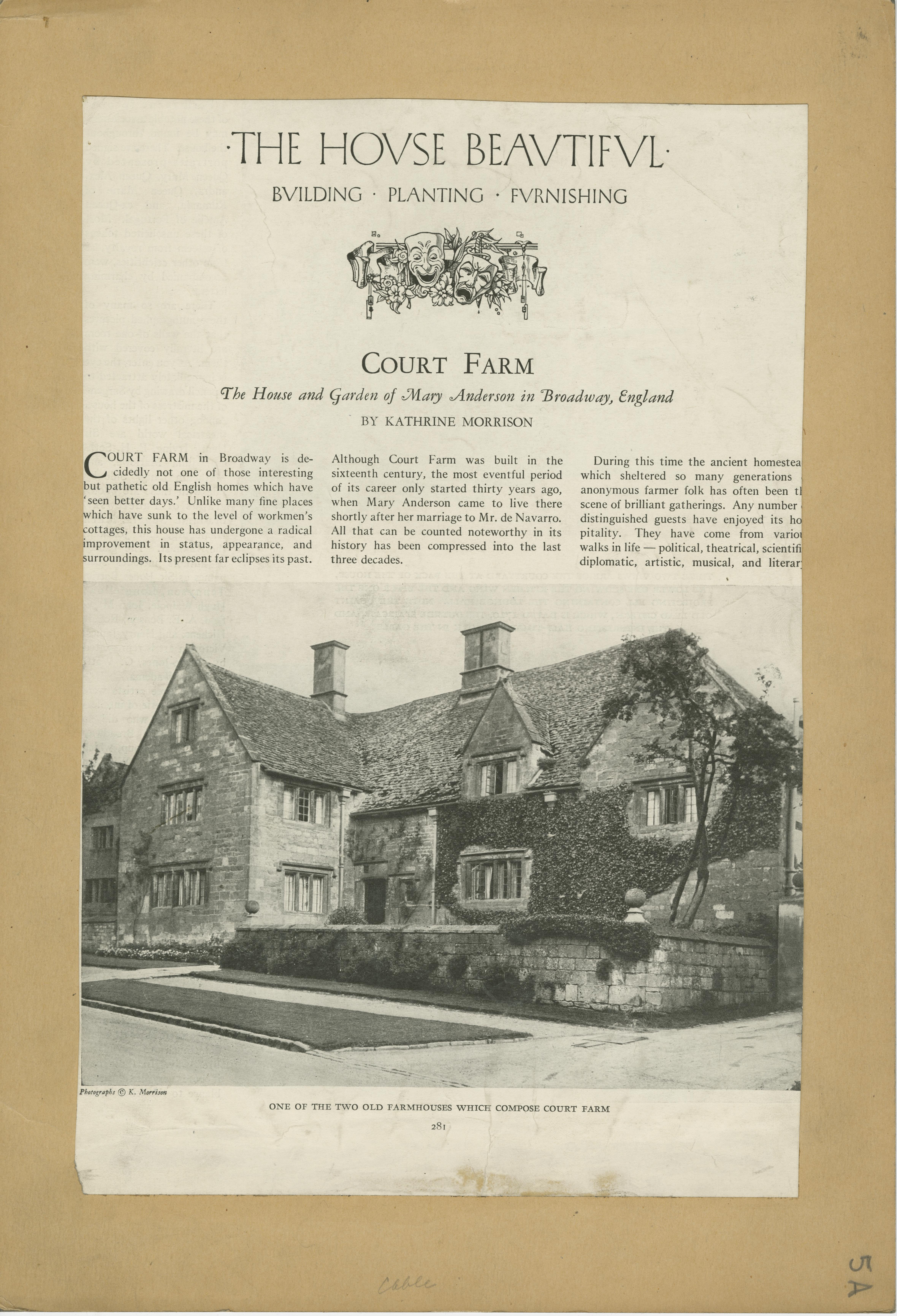 | Description | Location Box 5A Item 32 Front Side The House Beautiful Court Farm Article House and Garden of Mary Anderson in Broadway, England |