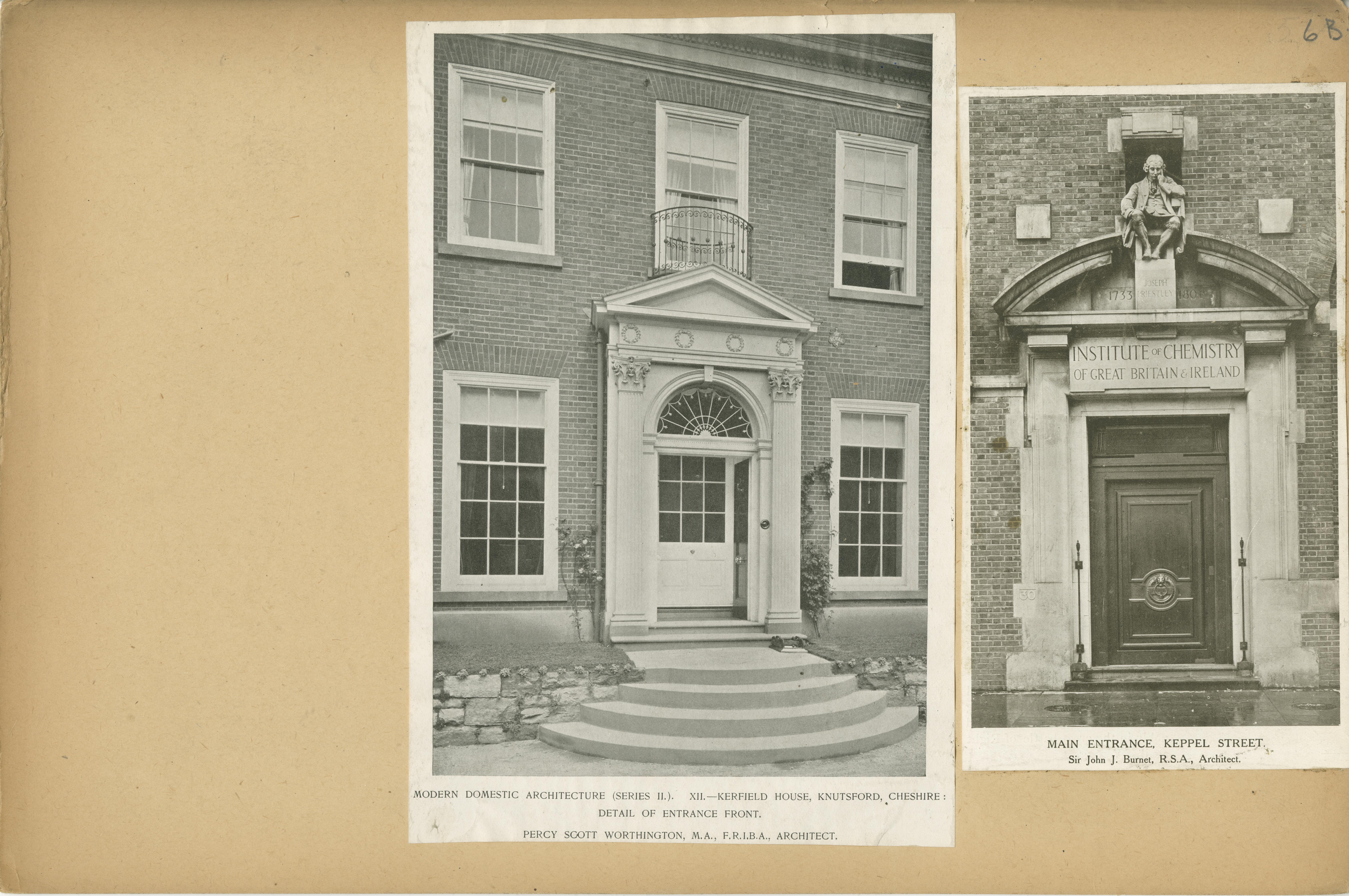 | Description | Location Box 6B File 1 Modern Domestic Architecture Kerfield House, Knutsford, Cheshire, Detail of Entrance Front Percy Scott Worthington, M. A., F.R.I.B.A., Architect Main Entrance, Keppel Street, Sir John J. Barnet, R.S.A, Architect |